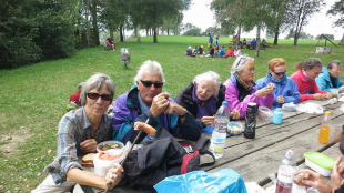 Nach einem Abstecher ins Chateau de Praz, danke Esther für den Tipp, freuten wir uns alle auf den edlen Tropfen!! Gross war die Enttäuschung. Das Beizli direkt am See, geschlossen! Vermutlich schon Nachsaison. Nach kurzem Aufenthalt, der Platz hier ist wahrlich traumhaft schön, gings weiter direkt am Wasser entlang. Immer wieder gabs am Wegrand etwas zu probieren oder zu kaufen. Zwetschgen, Brombeeren, Himbeeren, Bohnen, Zugeti, so heisst das auf französisch! (nicht gewusst)? oder auch Kleider wurden angeboten. Esther, Nelly, Rosemarie, Eliane und Ueli nahmen ohne grosses Zaudern ein erfrischendes Bad. Dank dem improvisierten Campingbeizli, das Ruth und Martina entdeckt haben, kamen wir dann doch noch zu unserem Glas Vully. Jetzt ist der Tag vollkommen, so die strahlende Heidi! Unsere Schleckmäuler wie Ruedi und wer noch? genehmigten sich ein Cornet.