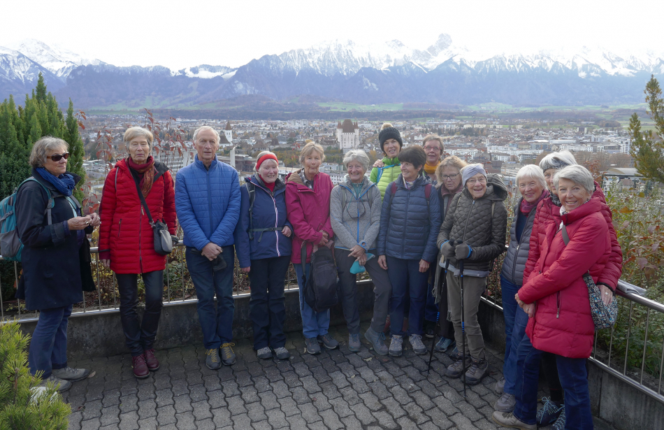 Der Wanderweg führt uns mitten durch die Terrassensiedlung, die meist nur von unten und von weitem wahrgenommen wird. Unser Sädtchen präsentiert sich für einmal aus einer ganz anderen Perspektive. Stockhorn und Niesen zeigen sich bereits in einem leicht winterlichen Kleid. Noch um ein paar Häuserecken, zuletzt ein schmales Gässchen und wir erreichen das «Bistro Promenade».