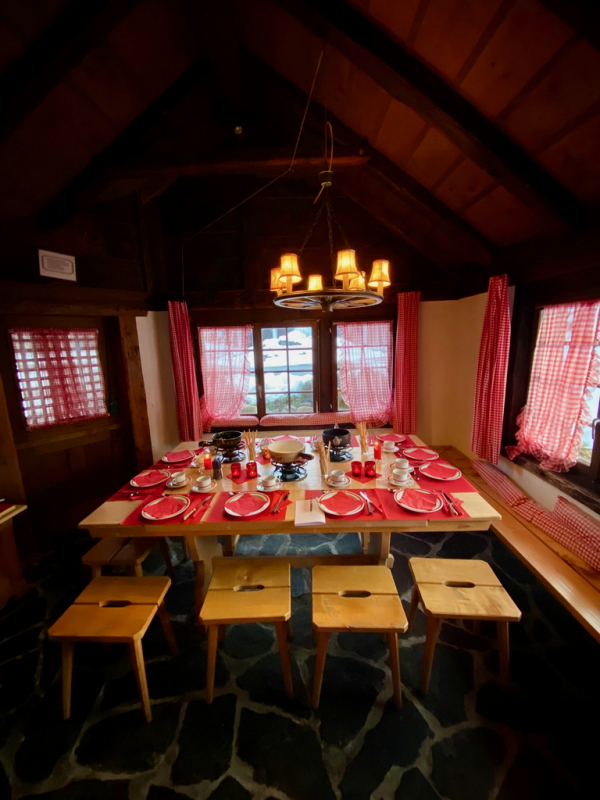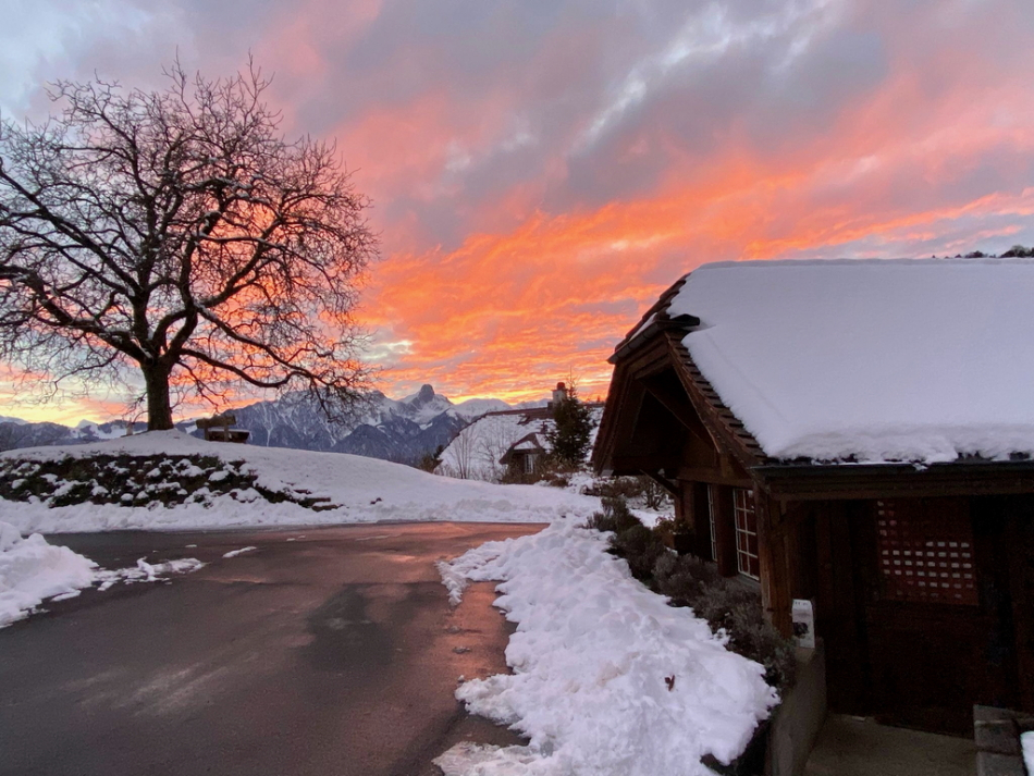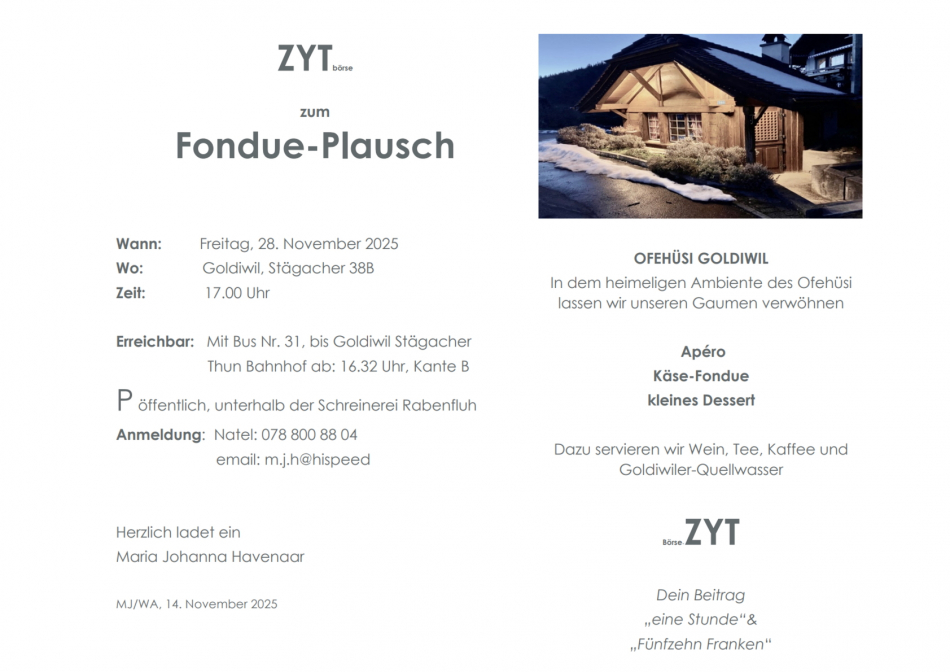 Die Abendstimmung am 28. November 2025 auf dem Weg nach Goldiwil war so einmalig, dass einige Teilnehmende am Fondue-Plausch der Zytbörse den Umweg über Heiligenschwendi wählten. An dem von Maria Johanna liebevoll dekorierten Tisch fanden dann auch die Nachzügler noch einen Platz.